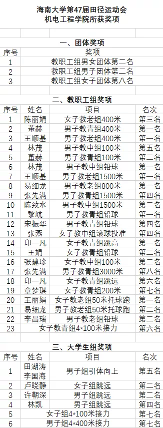 11月15日,田径运动会的最后一天,赛事气氛达到了最高潮,每一位选手都拼尽全力去争夺胜利。下午16时,经过三天激烈角逐,海南大学女子第47届田径运动会,在海甸校区第一田径场圆满落幕。我院取得了教职工组男女团体第二名、教职工组男子团体第二名和教职工组女子团体第八名,机电运动员也取得了优异成绩。