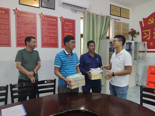 刚到光吉村,师生一行人便受到驻村第一书记曲军远、村委书记庞干春同志的热烈欢迎。海南大学选派驻村第一书记曲军远表示,希望机械系学生党支部与光吉村党建工作从两个方面开展联建活动:一是加强“不忘初心、牢记使命”主题教育;二是以主题党日或微党课等形式搞活党员教育方式。光吉村党支部书记庞干春表示,希望能在老师与同学的党建交流指导下,更好的建设“六星党支部”,努力从村中产业、群众服务、文化传承等方面打造振兴乡村的战斗堡垒,促使农村焕发出更强大的生机与活力。