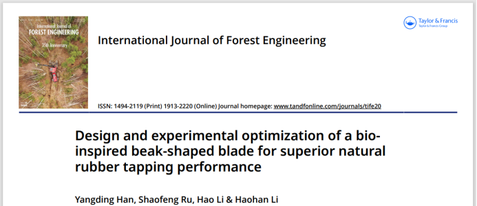 我院汝绍锋副教授团队在仿生木材加工与橡胶割胶技术领域的研究,从传统机理分析、仿生设计与磨损机制研究,再到多目标优化与实际应用验证,形成了一条完整、系统的创新链条。系列成果不仅为提升我国天然橡胶产业的自动化水平和可持续发展能力提供了关键技术支撑,也为高效、低损伤木材切削刀具的仿生设计建立了新的理论范式。研究得到国家自然科学基金(52305251)项目的资助。